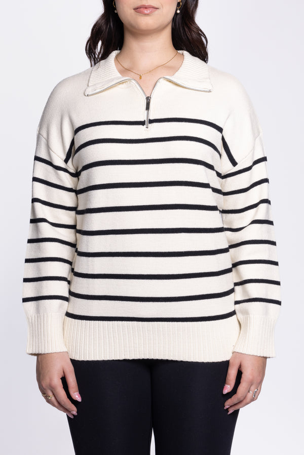 SW006 – Long Sleeve Sweater (Cream with Black Stripes) Fabric: 53% Viscose / 26% Polyester / 21% Polyamide Features: Front zipper closure, long sleeves Fit: Regular Details: Soft-hand feel, stretch...